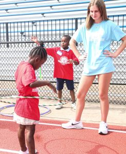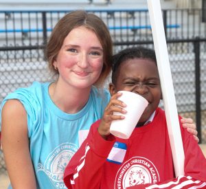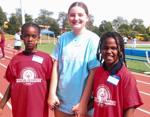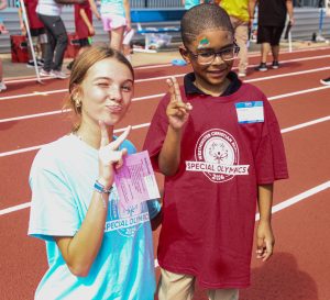 Special olympics athlete bonds with student volunteer over a game of kickball