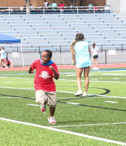 Special olympics athlete plays a game of kickball with volunteers and fellow athletes