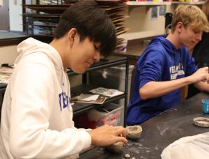 Two Westminster students mold and sculpt the bases of clay pots