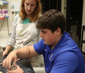 Art teacher instructs ceramics student on how to construct a clay vase