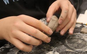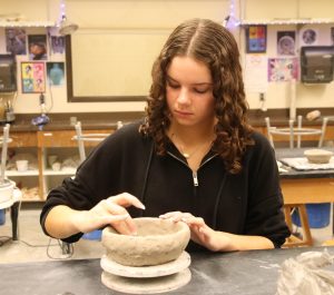 Ceramics student carefully molds the sides of a small clay bowl