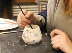 Ceramics student paints the sides of a a clay mug with polka dots