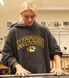 Westminster ceramics student rolls out the sides of a clay bowl