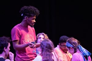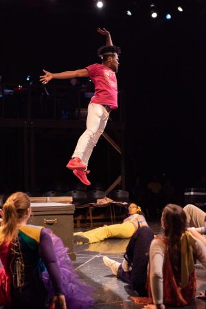 Jesus (Michael Lee, senior) jumps off a crate during a parable.